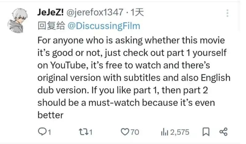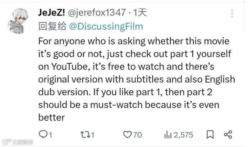 对部分外国观众来说,《哪吒》并不是一部他们熟悉或了解的电影。有网友在评论区回应并推荐道:“如果有人问这部电影是否值得看,可以在YouTube上找到第一部,既有带字幕的原版,也有英文配音版。如果你喜欢第一部,那第二部绝对不容错过,因为它比第一部更精彩!”