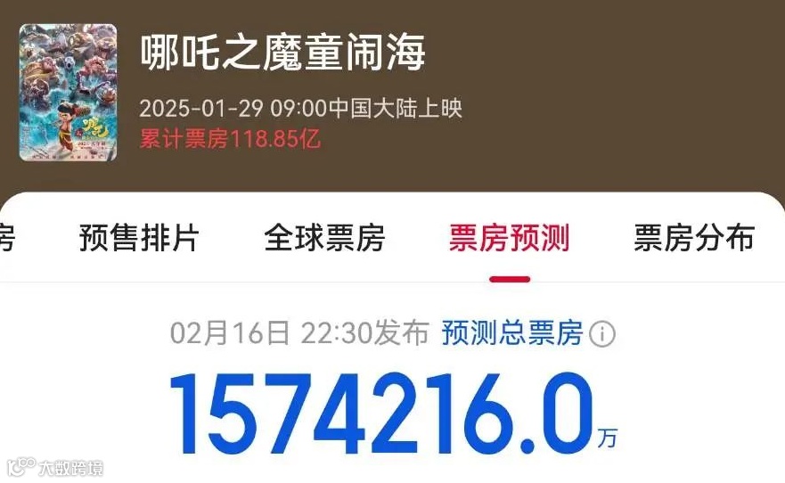 最新数据显示,“猫眼专业版”预测《哪吒2》最终总票房或将超157.42亿,“灯塔专业版”预测这一数据为150.42亿。