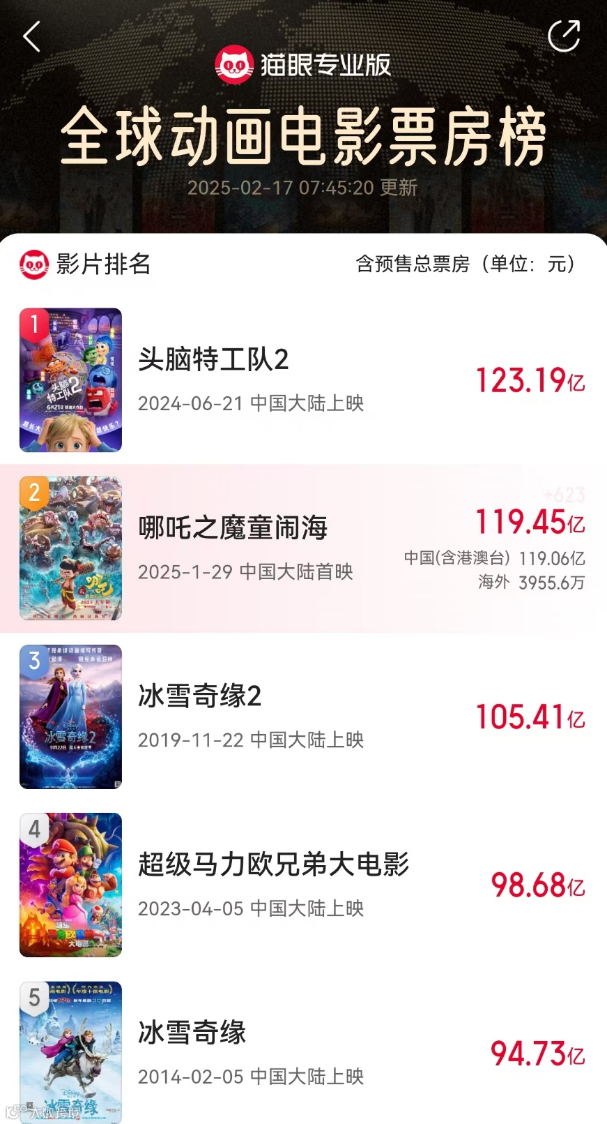 截至今早7点45分,《哪吒2》总票房(含海外)即将突破120亿,今天将冲击全球动画票房榜TOP1纪录。