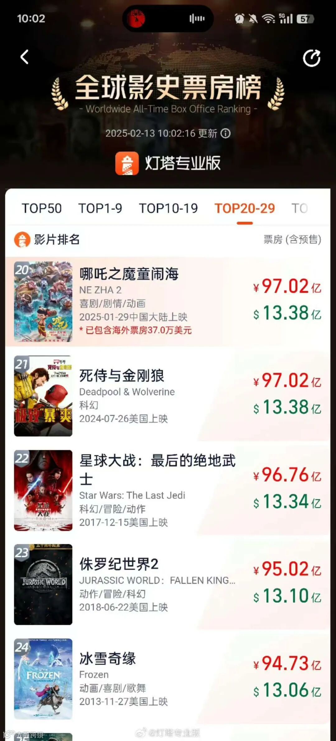 2月13日,据网络平台数据,电影《哪吒之魔童闹海》总票房突破97亿,超越《死侍与金刚狼》票房,位居全球影史票房榜第20位。