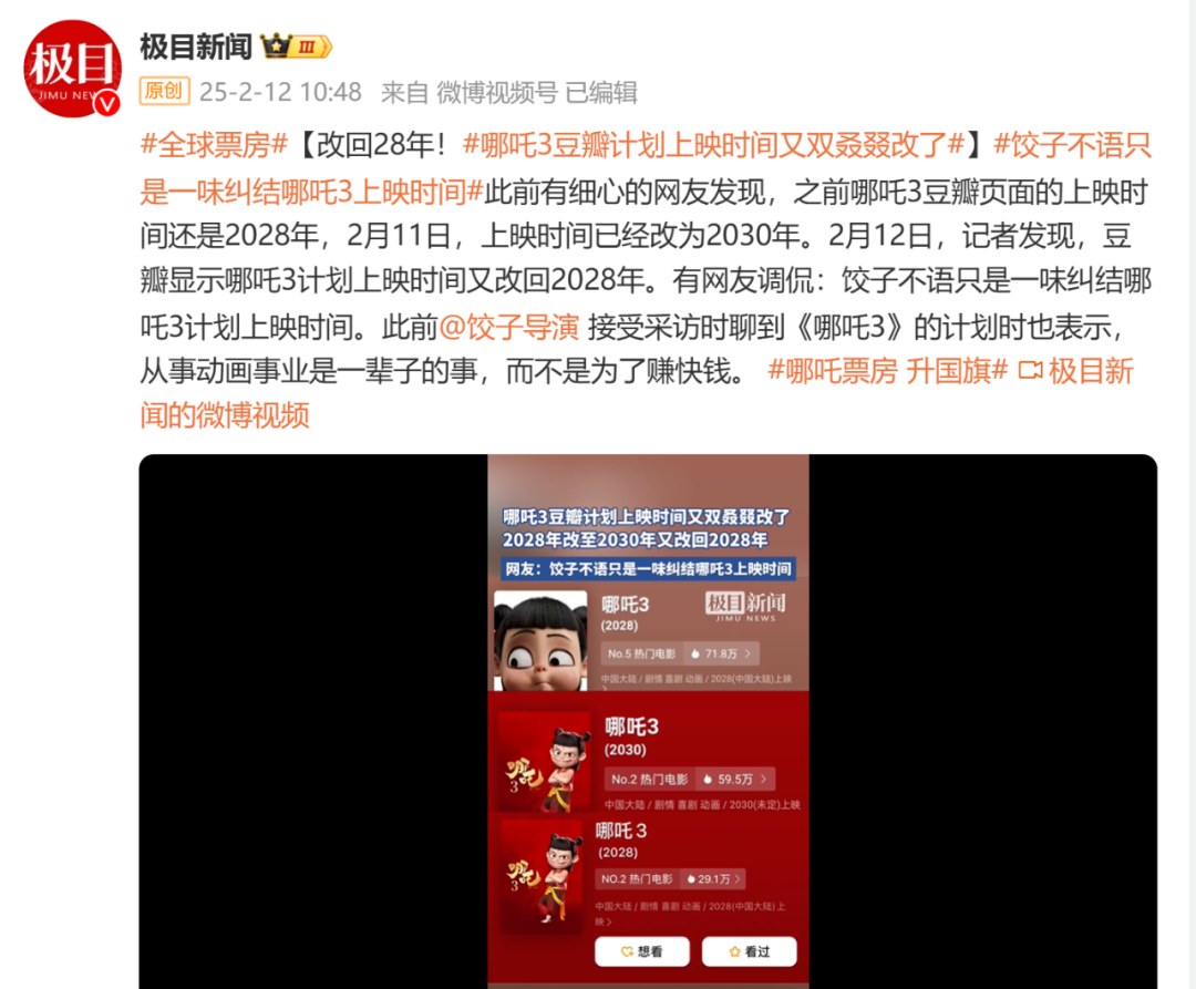 2月12日,豆瓣显示《哪吒3》计划上映时间又改回2028年。