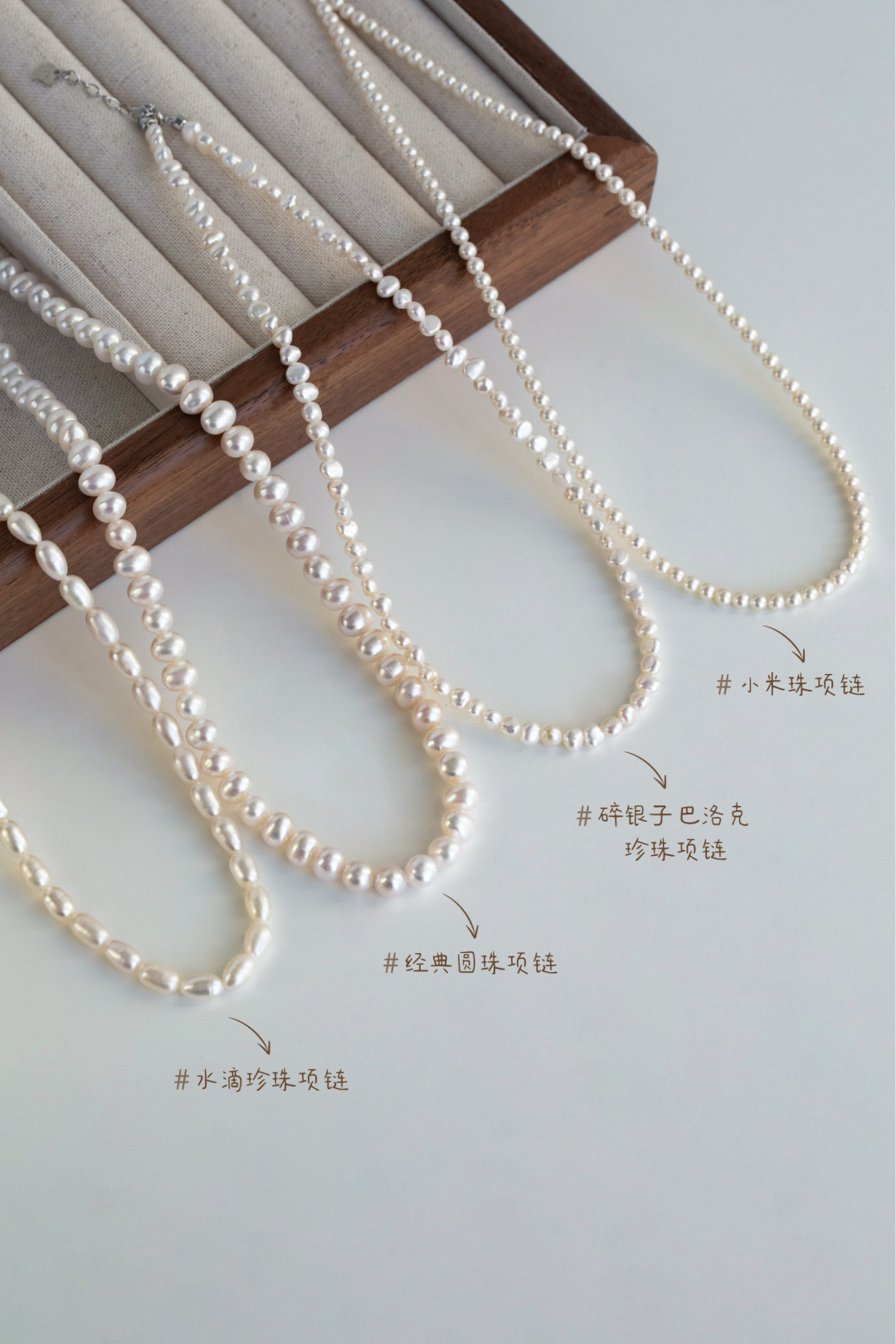 珍珠项链共有四款,经典圆珠项链、小米珠项链、碎银子巴洛克、水滴珍珠项链。