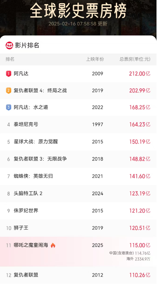 截至今早8时许,《哪吒2》总票房突破115亿,距离全球影视票房榜第十名只差5.5亿,很有可能今日《哪吒2》将进入全球影视票房榜前10。