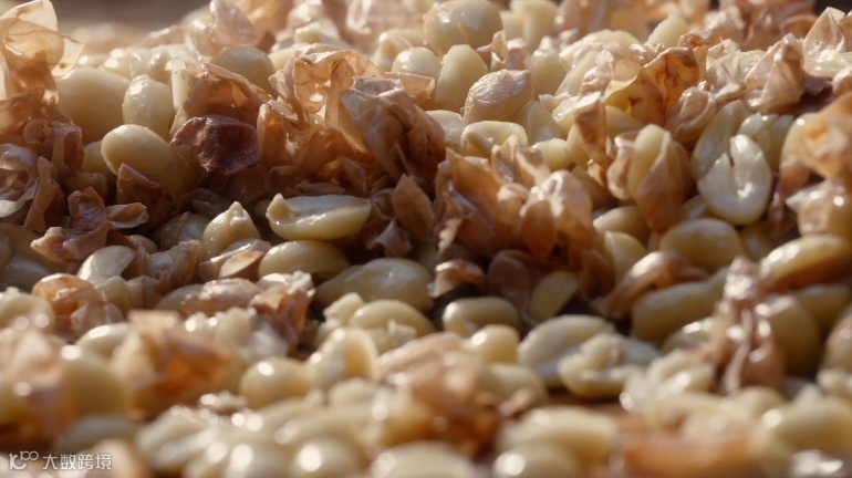 先用自制木板搓掉花生衣,把花生仁分成两半。