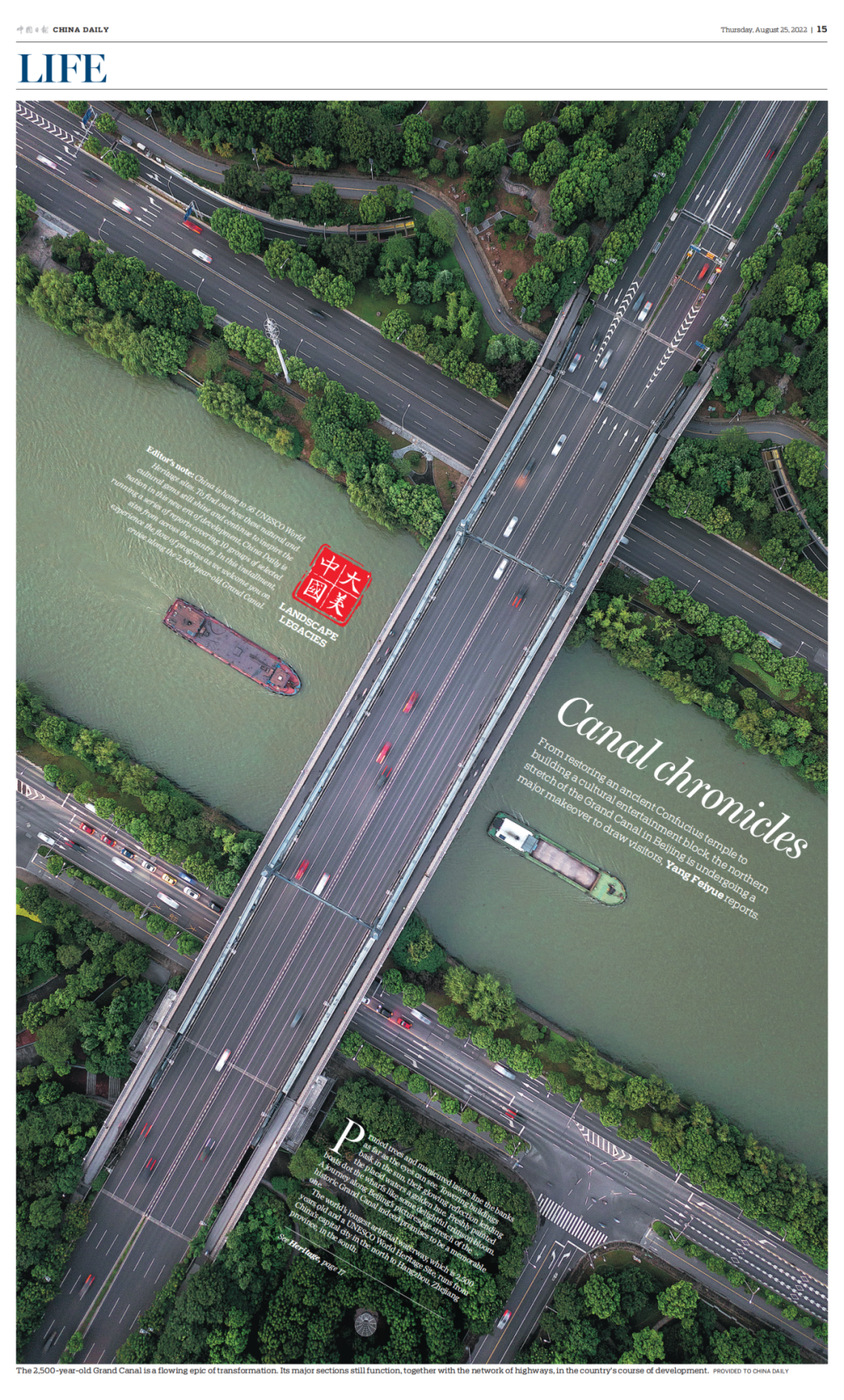 它很多页面的排版都充满巧思。比如讲到大运河,报纸就结合大运河的走向对文字进行了斜向排版,使文字和图片产生互动,并形成一个和谐整体。