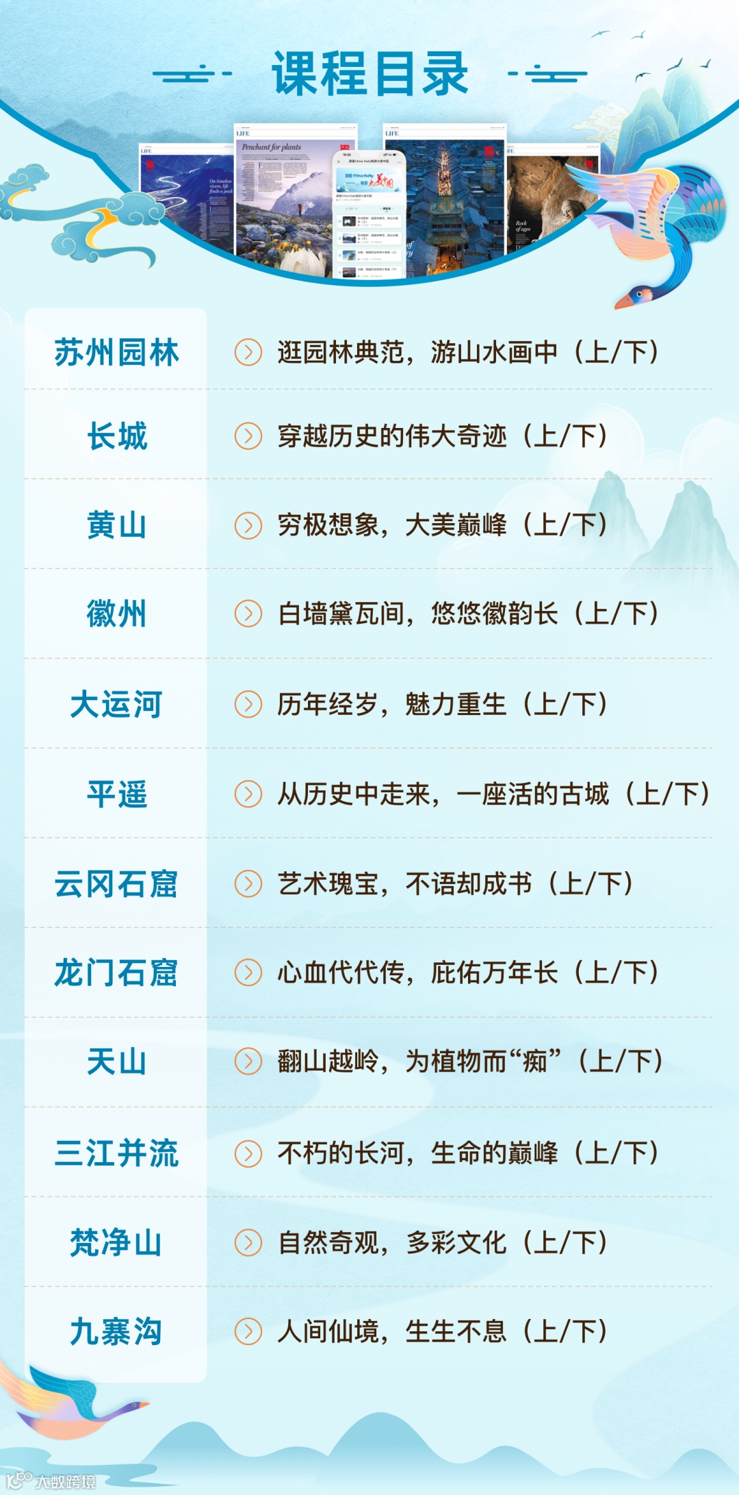 再比如讲到黄山这一篇,我们从小就知道“黄山归来不看岳”、黄山上有迎客松和猴子观海,但是它们具体用英文都怎么表达呢?老师在课程里都有详细的介绍。
