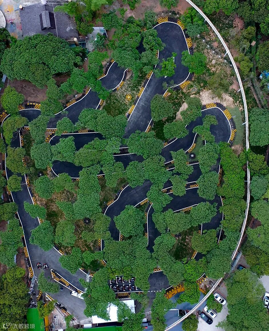 在设计之初,项目就因地制宜,保留了场地原有地势与景观风貌。道路模拟山地地形,绕树穿行,呈现高低1.5米的落差。在绵延起伏的赛场上竞速、漂移,享受更刺激的驾驶体验,为紧张忙碌的都市人提供肆意放松的场所。