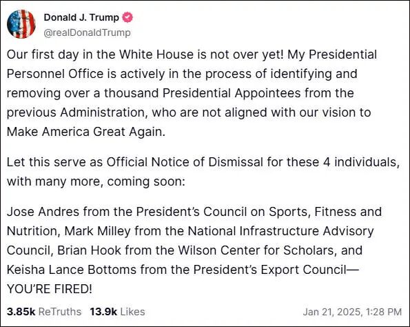 Trump's post said his personnel office "is actively in the process of identifying and removing over a thousand Presidential Appointees from the previous Administration, who are not aligned with our vision to Make America Great Again."