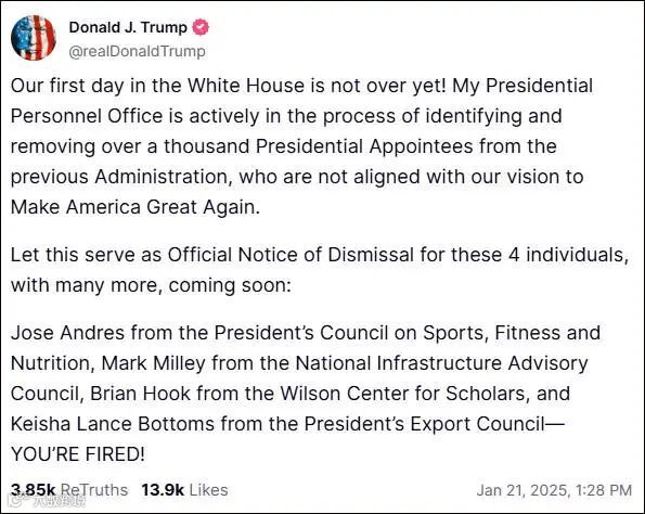 “白宫首日还没结束呢!”特朗普在自创社交媒体平台“真相社交”上发文称:“总统人事办公室正积极地从上届政府中挑选一千多名前总统任命的人并开除,他们与我们‘让美国再次伟大’的愿景不一致。”