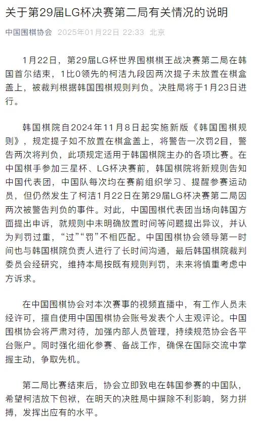22日晚,中国围棋协会回应柯洁被判负,表示中国队在赛前已学习韩国新规,中国围棋代表团已当场向韩国方面提出申诉,最后韩国棋院裁判委员会维持本局按既有规则判罚。