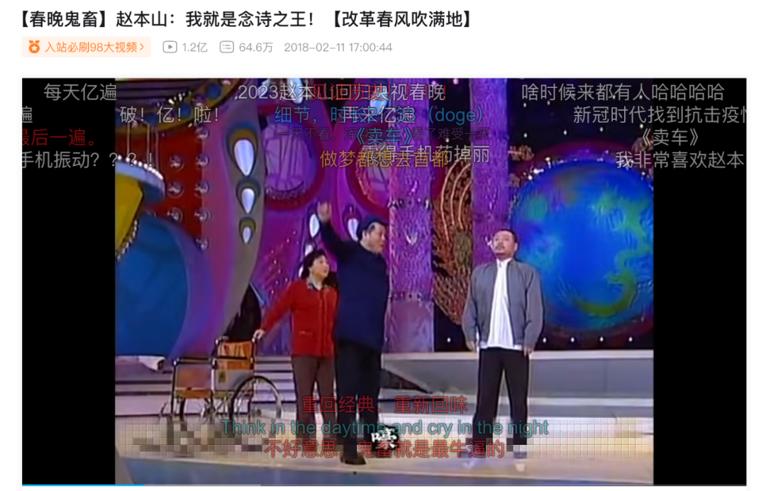 B站上,UP主“小可儿”以赵本山、宋丹丹小品《昨天,今天,明天》为素材创作的鬼畜歌曲《改革春风吹满地》,播放量高达1.2亿,成为很多年轻观众的玩梗宝典。