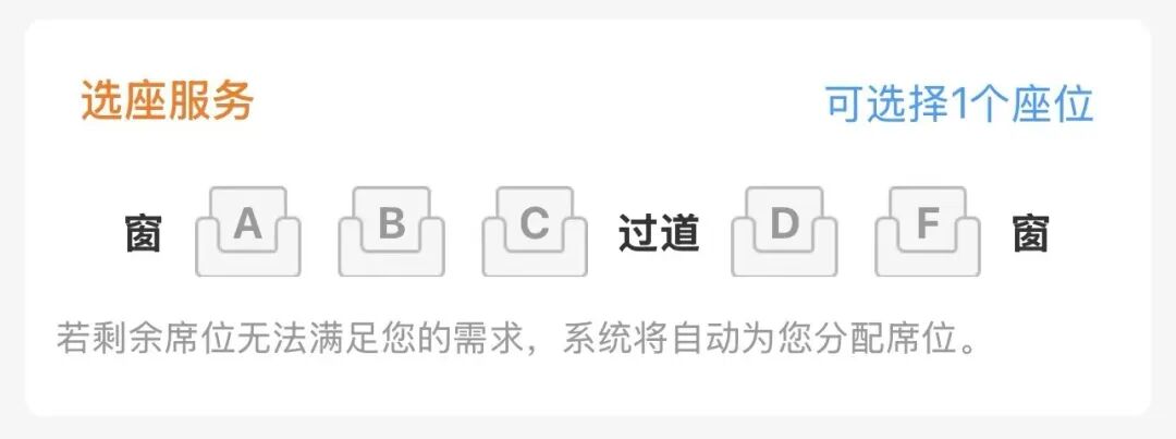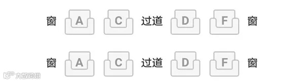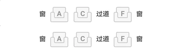 “A、F”表示靠窗的位置(window seat),“B、E”是中间位置(middle seat),“C、D”表示靠过道的位置(aisle seat)。