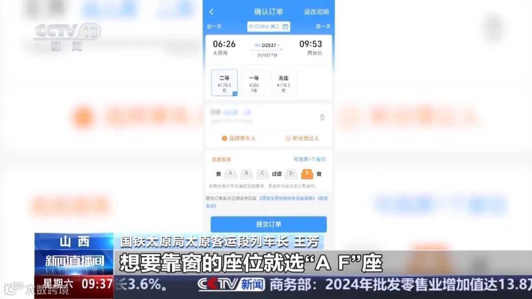 王芳称,登录12306网页或者手机App,您可以选择出行日期和车次,提交订单后,在剩余车票充足的情况下,即可进入选座界面。想要靠窗的座位就选“A、F”座,想紧邻过道就选“C、D”座。如果坐哪儿都行,不选择座席,就直接点击“确定”,系统将自动为您分配座位。
