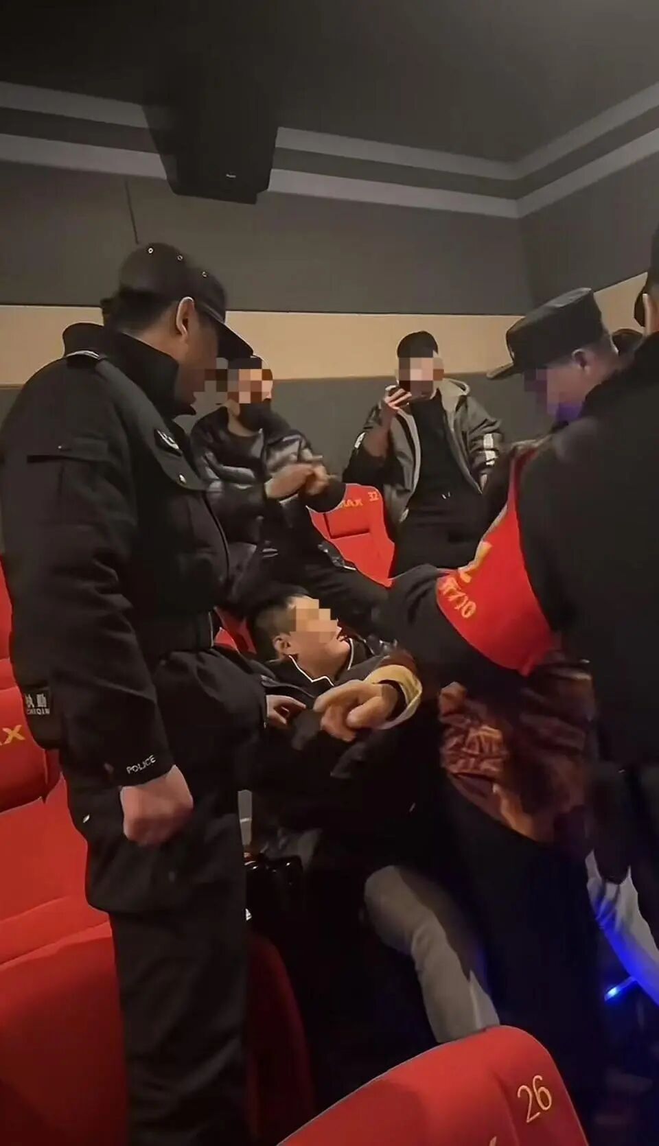 视频显示,电影院内一男子站在后排座位上,情绪激动称“我就坐,你管我怎么着?!”疑似是因座位与他人发生争执。后续警方抵达现场处理,现场观众大喊“出去!出去!”