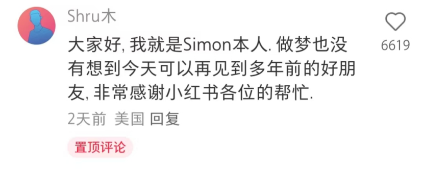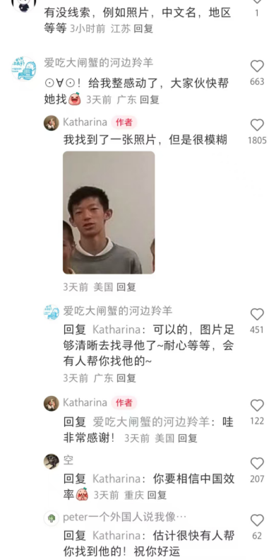 视频评论区的中国网友立即行动开始全网“捞人”,有网友评论“给我整感动了,大家伙快帮她找”。果不其然,仅凭一张卡塔琳娜提供的西蒙旧照,不到24小时西蒙成功找到。