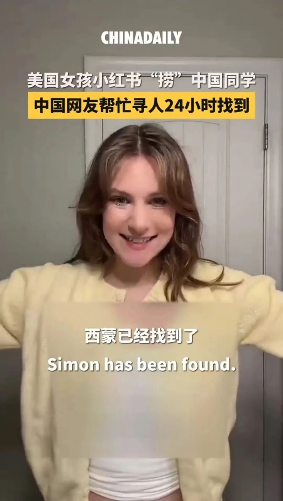 “我需要你的帮助,当我上七、八年级的时候,学校里有一位中国交换生,他的英文名字叫西蒙,那一年我们是最好的朋友。然后他搬回中国,我们无法交流,我很伤心。我需要这个应用程序上的所有网友帮忙找到他。西蒙,我想念你,想念我们的友谊。”