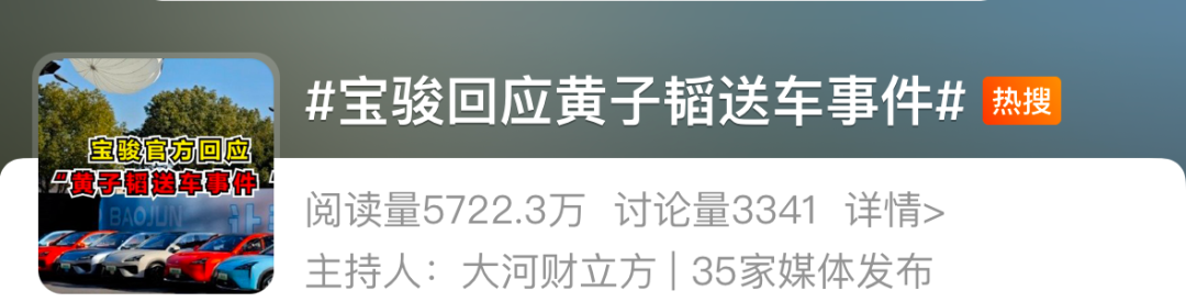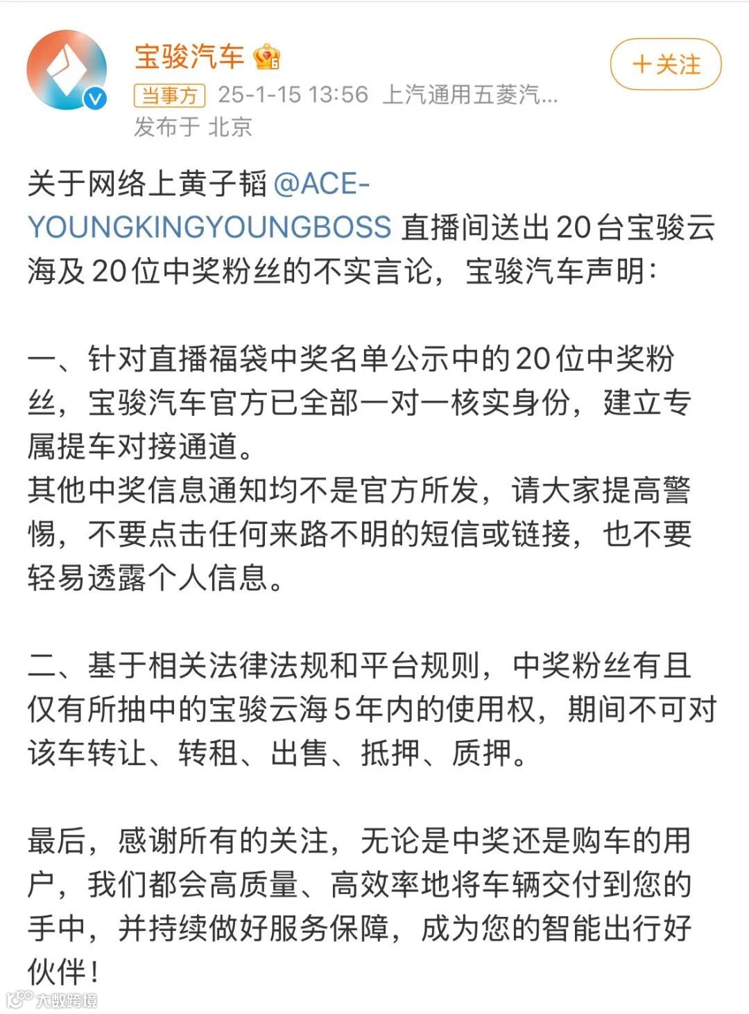 针对黄子韬直播间送车相关情况,宝骏汽车官方在1月15日发表声明,相关话题冲上热搜。