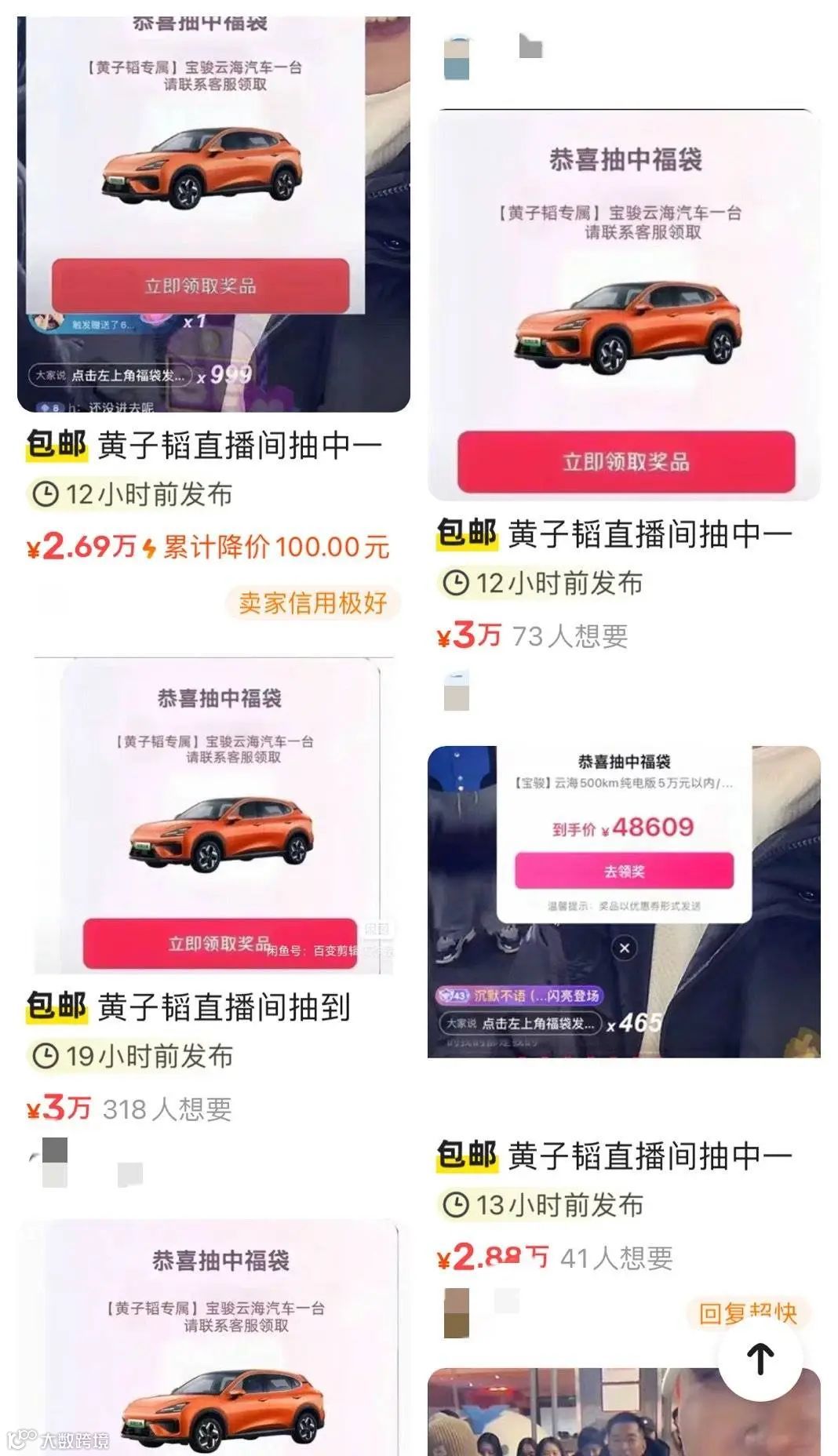 有二手平台从业者就平台上售卖“黄子韬直播间抽中一台宝骏云海”等内容比送出的车还多的问题表示,“一些商家通过设置低价吸引消费者进入主页浏览,以此达到引流目的。”