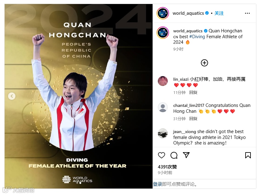 Earlier, the World Aquatics officially announced the list of candidates for the best diving female athletes of 2024, including Quan Hongchan, Chen Yuxi, Chen Yiwen, Chang Yani and Madison Keeney.