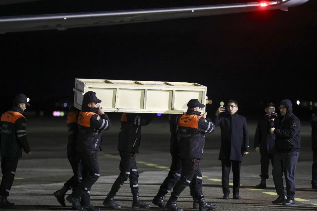 当地时间2024年12月28日,阿塞拜疆机场,工人们搬运事故遇难者遗体。图源:视觉中国