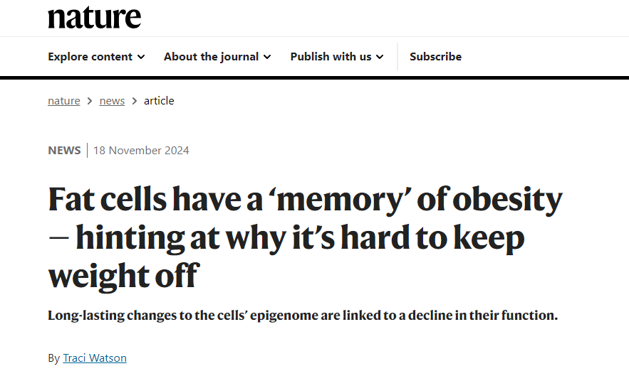 今年11月,《自然》杂志发表的一项研究显示,即使大幅减重后,身体的脂肪细胞仍携带了对肥胖的“记忆”——该发现或解释了为何成功减重后很难维持。