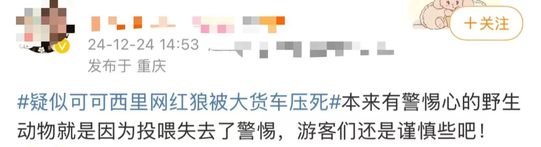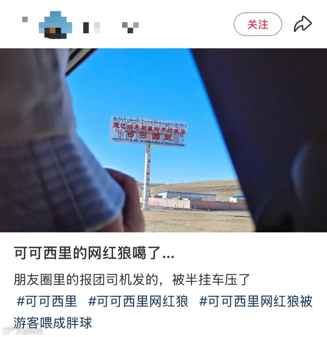 一名在附近提供旅拍服务的摄影师也在社交平台发帖《可可西里以后再没有网红狼了》,“网红狼趴在地上,原来是被大车撞了。车上的上海小姐姐帮忙打救助电话,剩下的下车去找保护站的人”。