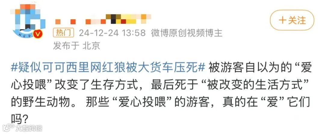 12月23日,多名网友在社交平台发文称,疑似因被游客投喂食物而变得膘肥体壮的“可可西里网红狼”被一辆大货车不慎轧死。