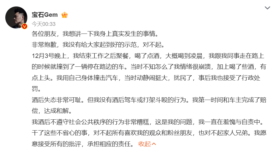Chinese rapper Dong Baoshi, also known as Gem, issued an apology early Friday following rumors of a drunken incident. He explained that after finishing work on Dec 3, he attended a dinner where he had some drinks. While walking with colleagues afterward, he accidentally hit a parked car.
