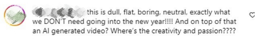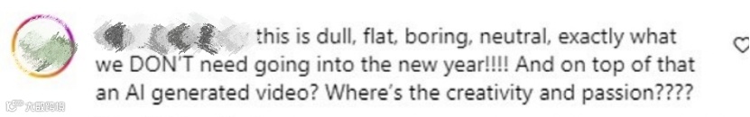 还有网友批评道:“这太沉闷、平淡、无聊了,我们在新的一年里不需要这样的东西!而且,还是个人工智能生成的视频?创意和激情去哪了?”
