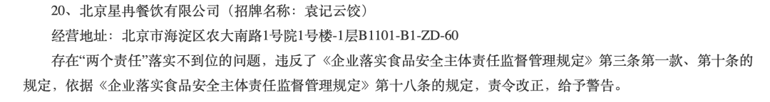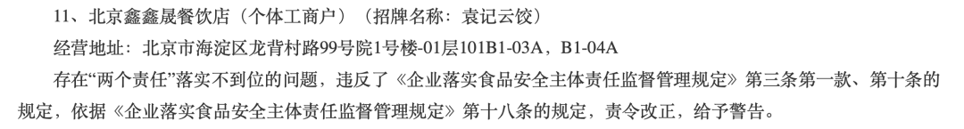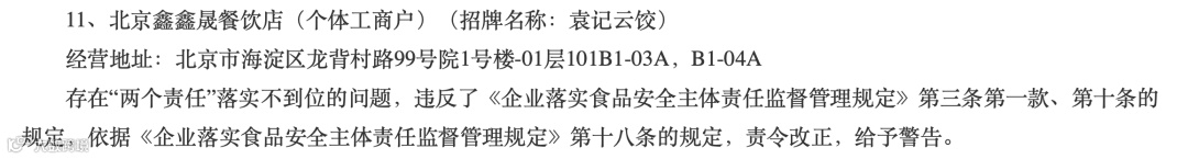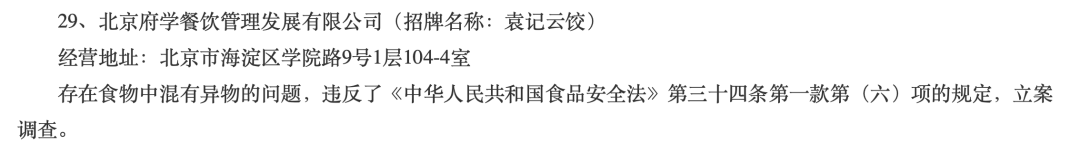 其中,因食物中混有异物,招牌为“袁记云饺”的北京府学餐饮管理发展有限公司被立案调查。该门店与此前消费者“吃出蚯蚓”的袁记云饺门店营业执照名称一致。