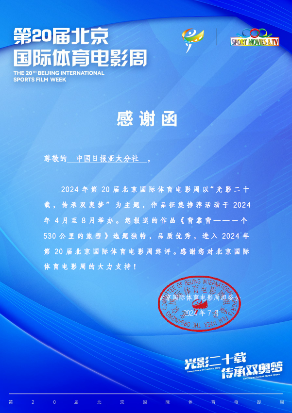 中国日报原创纪录片《背靠背——一个530公里的旅程》近期入围多个国际电影节,包括澳大利亚RunNation 巡回短片电影节、秘鲁INKAFEST 2024山地电影节、罗马尼亚Transylvania山地电影节、 美国LaCrosseAF Adventure Festival,以及第20届北京国际体育电影周等。
