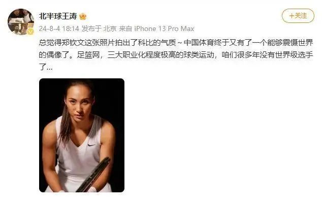 在郑钦文获得巴黎奥运会网球女单冠军后,前CCTV5、实况足球解说员王涛也分享了一张郑钦文的照片,表示郑钦文这张照片拍出了科比的气质。