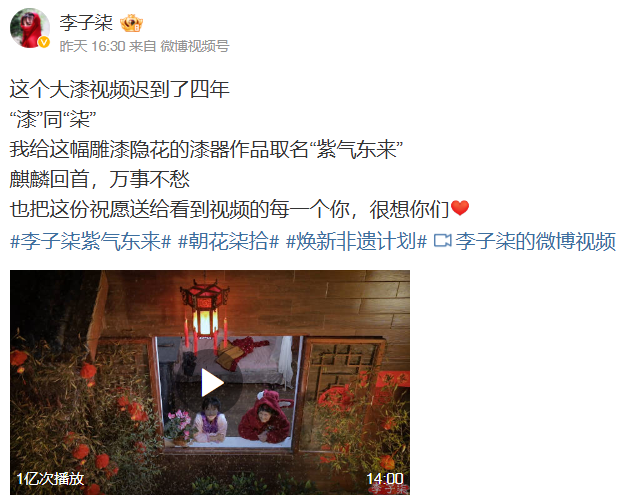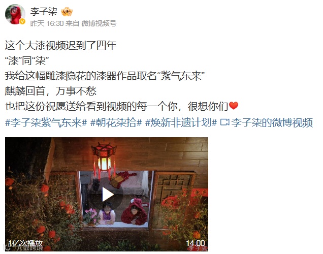 Quickly, Li's return became the top trending topic online and as of 10 am Wednesday, her lacquerware video had garnered 120 million views on Sina Weibo, with more than 1.94 million interactions, including shares, comments and likes.