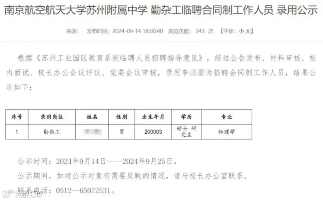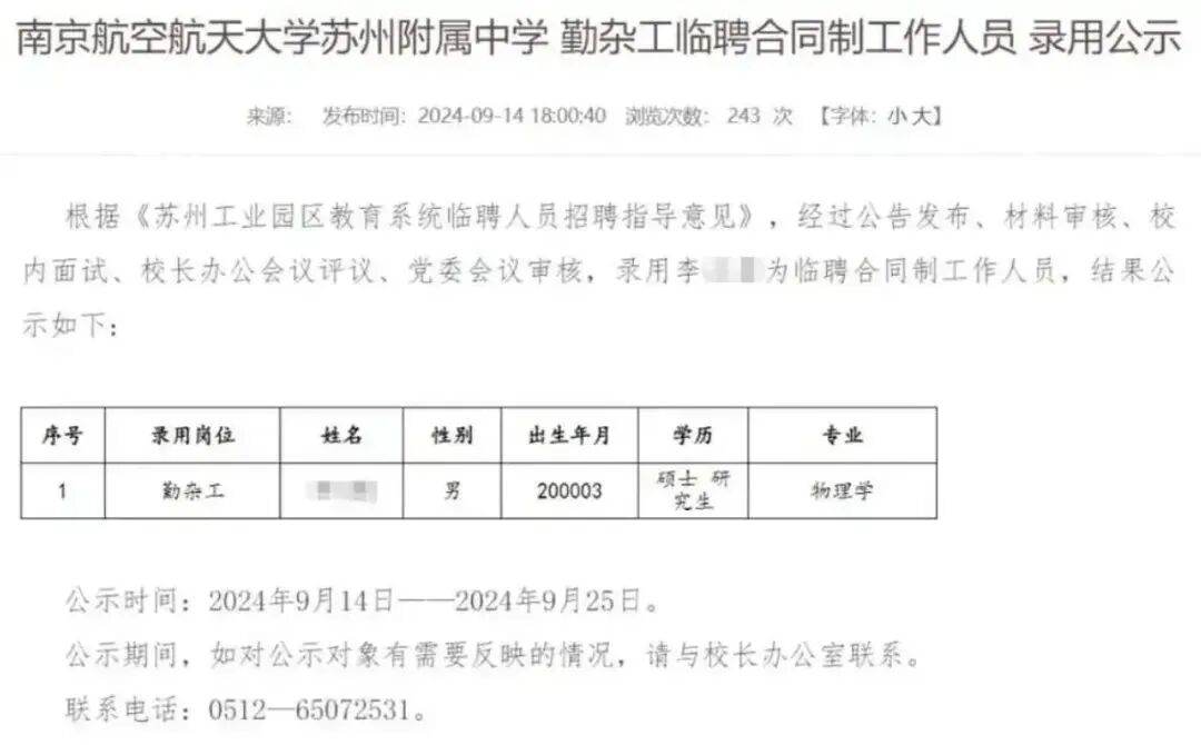 近日,一则“南京航空航天大学苏州附属中学勤杂工临聘工作人员的录用公示”显示,一名24岁物理学研究生拟被聘为该学校勤杂工,引发网友热议。