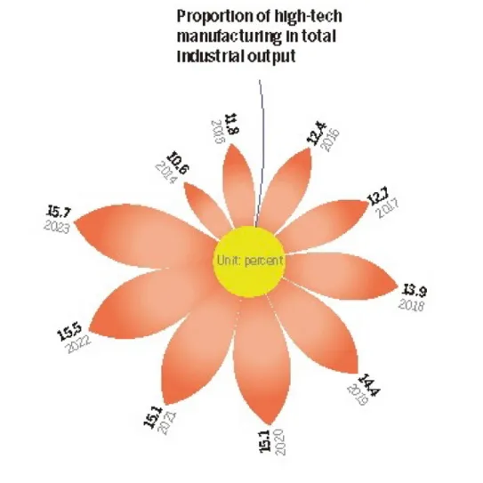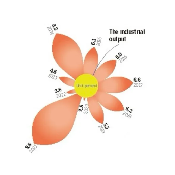 经济板块图表以花瓣形态呈现出口额增长,展示改革开放以来中国贸易额的迅速上升。图表显示出口从以低附加值产品为主逐步转向高科技、高附加值领域的过程,还以不同的色块和花瓣大小形象地展现出口结构的优化。