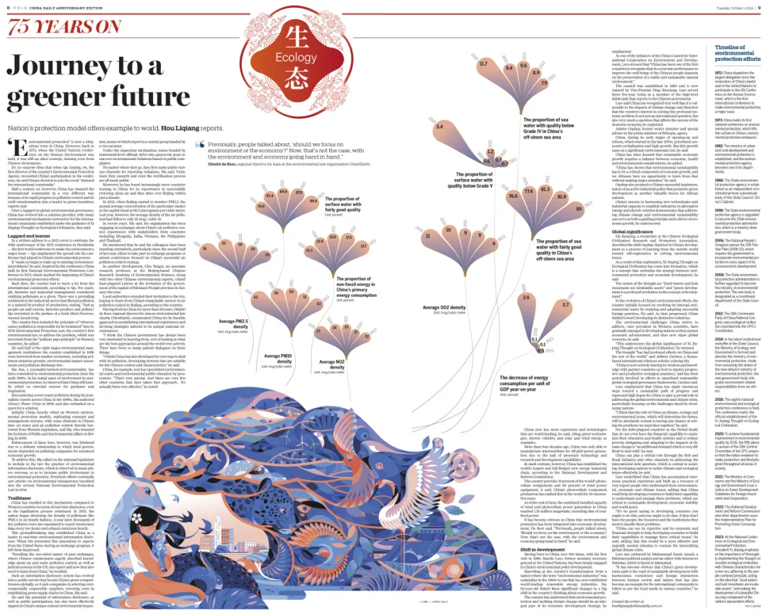 生态板块讲述中国已从全球环境治理的“学习者”,成为全球生态文明建设的参与者、贡献者、引领者。75年来,我国的生态环境保护取得了重大进展和实质成效,也为全球环境治理和应对气候变化提供了中国智慧、中国方案。中国将持续深化生态环境领域国际合作,积极参与和引领全球环境与气候治理,合力保护人类共同的地球家园。