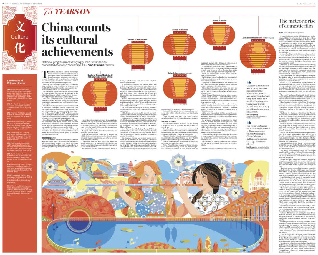 文化板块讲述中国积极推动社会主义文化建设,实现物质文明和精神文明的协调发展。特别是党的十八大以来,公共文化投入力度持续加大,公共文化服务设施不断完善。电影产业取得巨大进步,银幕总数赶超美国,成为全球银幕最多的国家,优秀国产电影成功出海,获得国际市场认可。