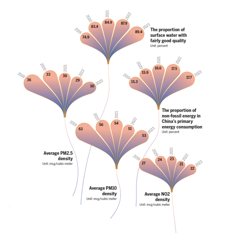 生态板块图表通过珊瑚状的扇形图展示中国空气质量显著改善,特别是PM2.5和PM10等主要污染物浓度逐年下降,清晰展现2013年到2023年间城市达标的比例。这些数据以形象化的扇形图呈现,直观且富有美感。