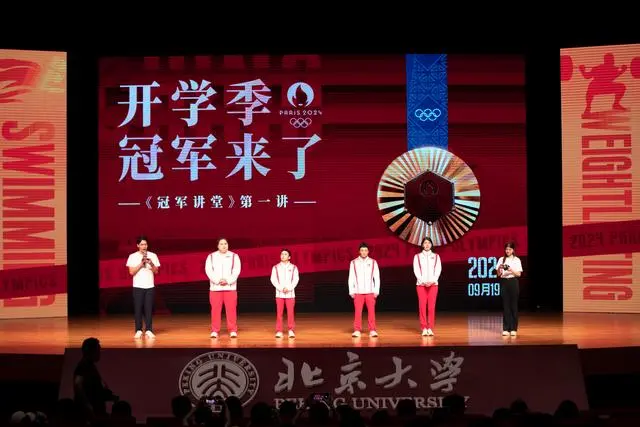 9月19日,《开学季·冠军来了》活动在北京大学百周年纪念讲堂举行。奥运冠军张雨霏、曹缘、邹敬园、李雯雯与北大师生面对面交流,分享他们的成长经历和训练比赛故事。