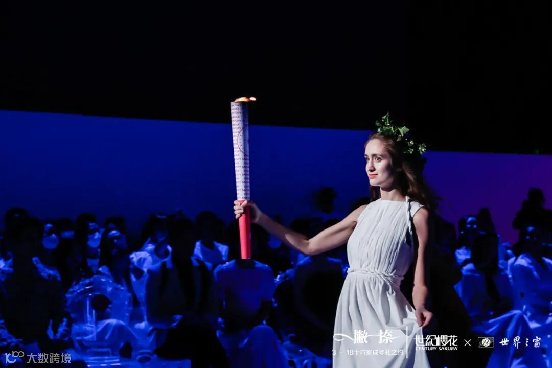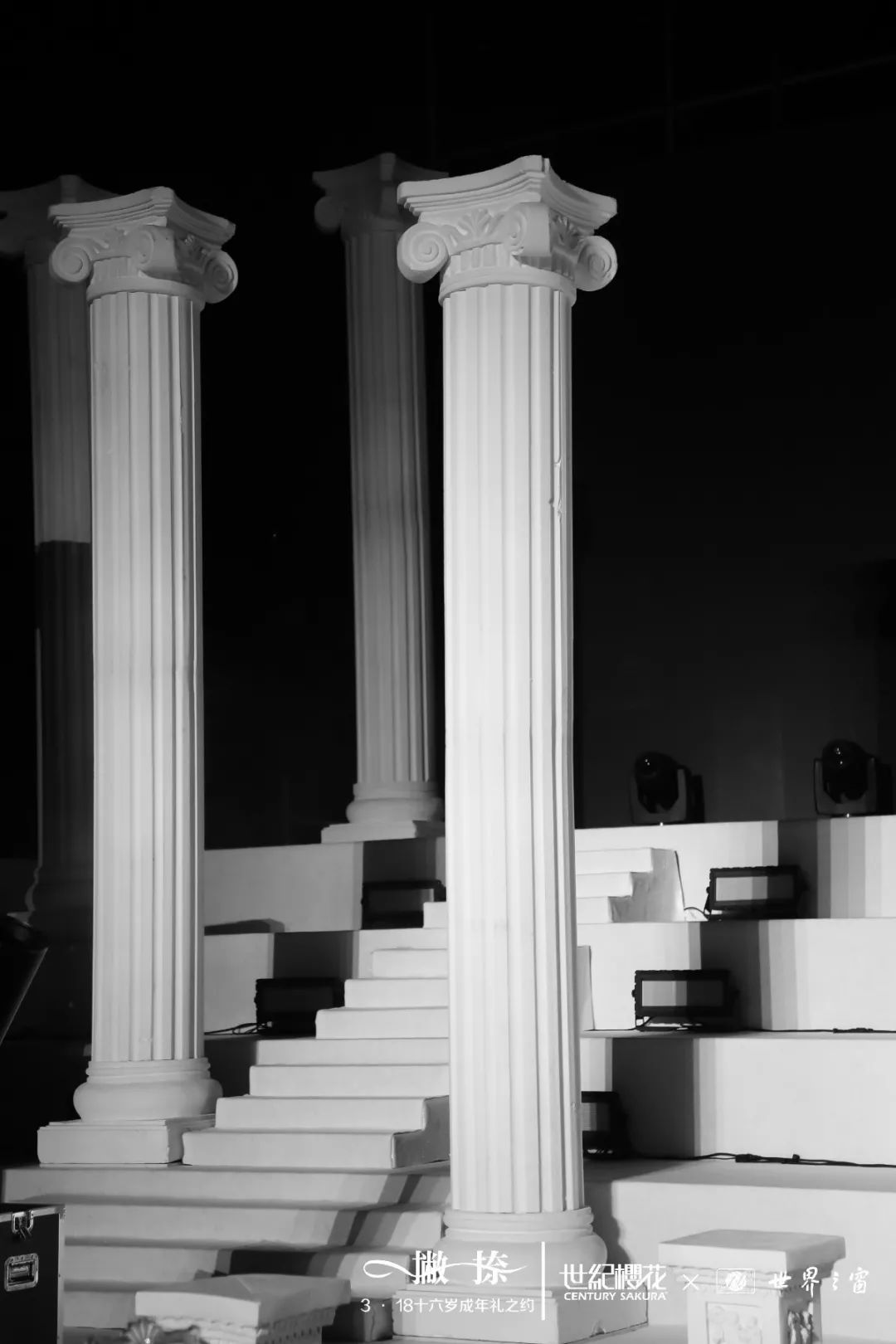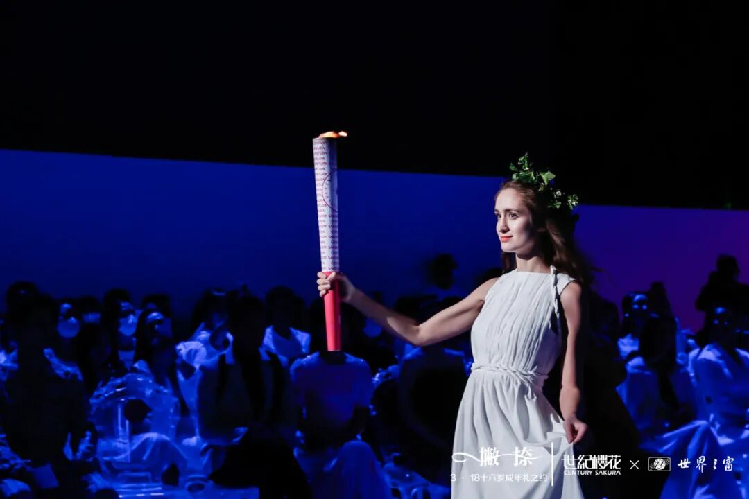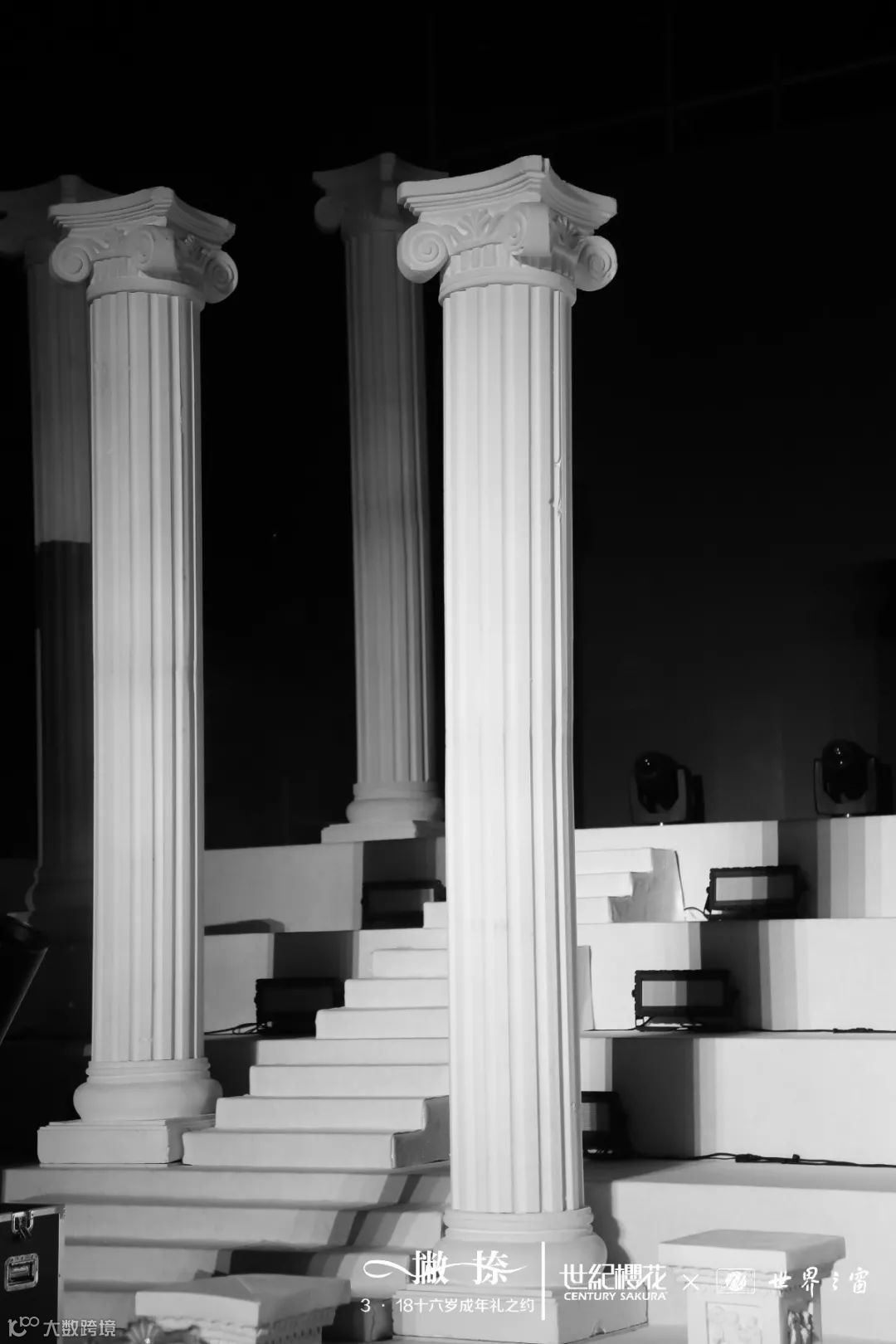 现场布置参考古希腊神话遗迹,辅以雕塑、石像、花艺、罗马柱等装置,致敬古希腊、致敬世纪樱花成年路上拼搏向上、敢闯敢拼的精神。
