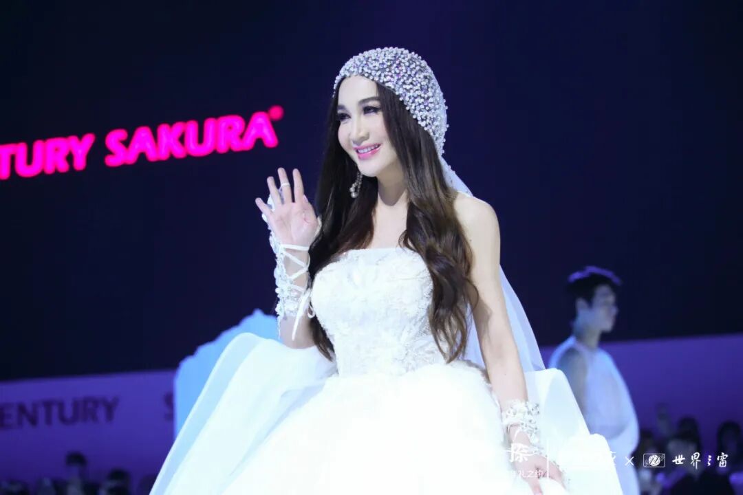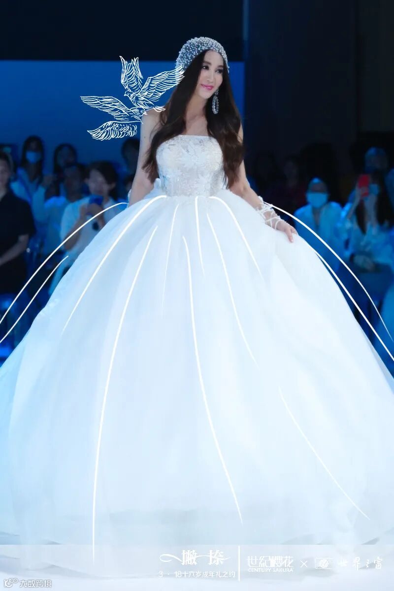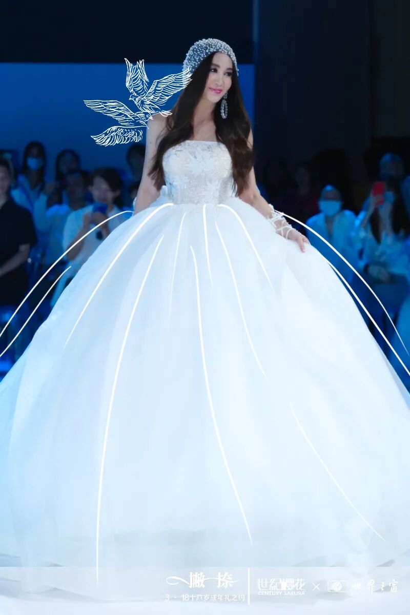 温碧霞一席白色婚纱长裙惊艳出场走秀,艳压全场,婀娜的身姿,引得现场掌声不断。