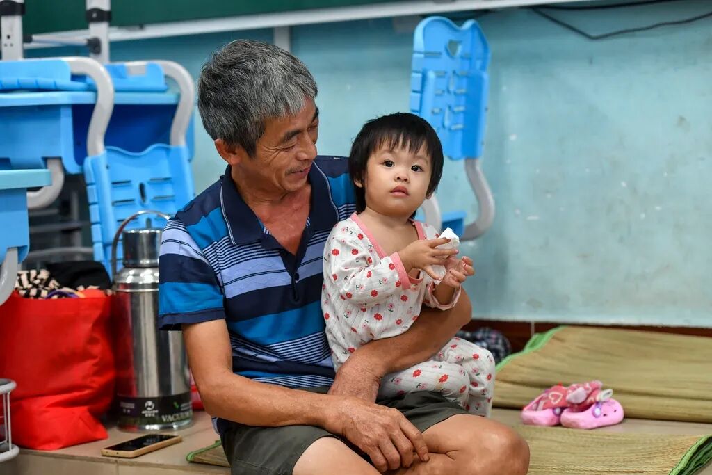 2024年9月6日,海南文昌,爷孙俩在文昌文城中心小学临时安置点内休息。图源:东方IC
