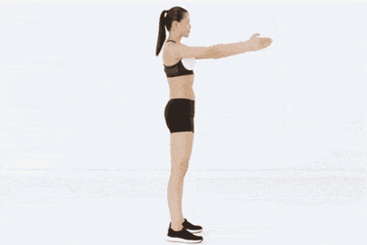 双脚分开与肩平齐。保持身体核心肌肉收紧的同时缓慢弯曲膝盖直到大腿和地面平行。随后缓慢把身体恢复到起始位置。