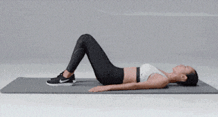 仰卧,双腿弯曲于身前90°,双手平放在身体两侧,肩膀贴地。将臀部抬至空中,使膝盖、上身、头部呈一条直线,保持几秒钟后,慢慢回到平躺位置。