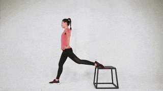 背部挺直,前脚脚尖朝前,膝盖和脚尖在同一垂直面,后脚固定在板凳上。吸气时前侧大腿屈膝下蹲,至大腿与地面平行,注意膝盖不要超过脚尖,呼气时起身还原。