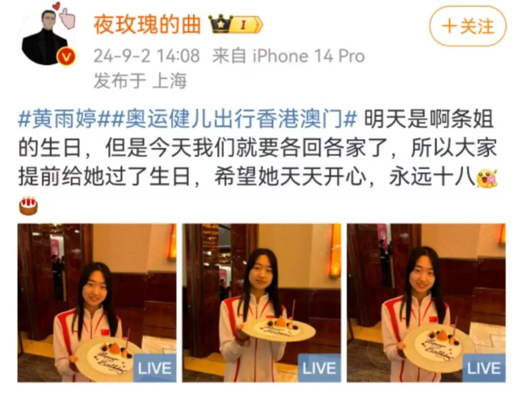 黄雨婷因为微博名@A阿条本条被网友称为“阿条姐”。9月2日正在澳门交流的运动员们提前为她过18岁生日,谢瑜捧着生日蛋糕,大伙为她齐唱生日歌,现场十分温馨。