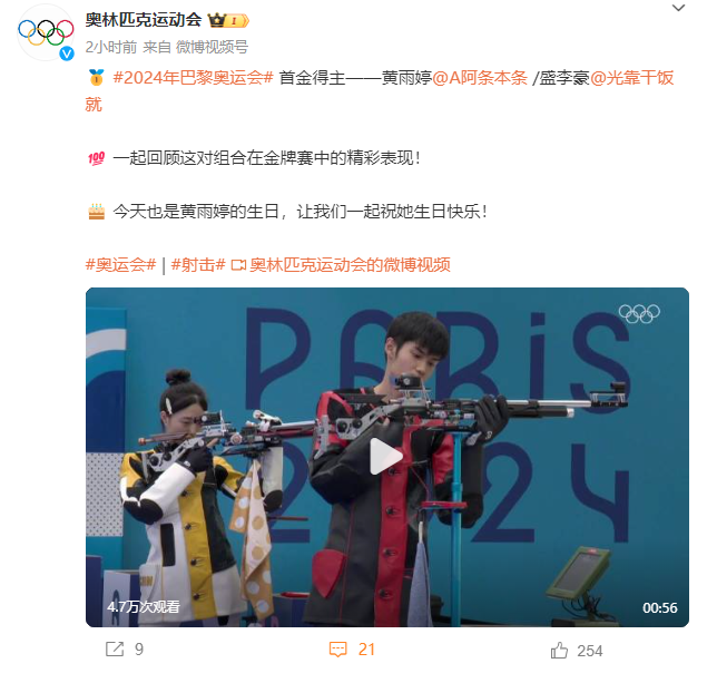 9月3日是2024年巴黎奥运会首金得主黄雨婷的生日,国际奥组委官方微博发文祝黄雨婷生日快乐。