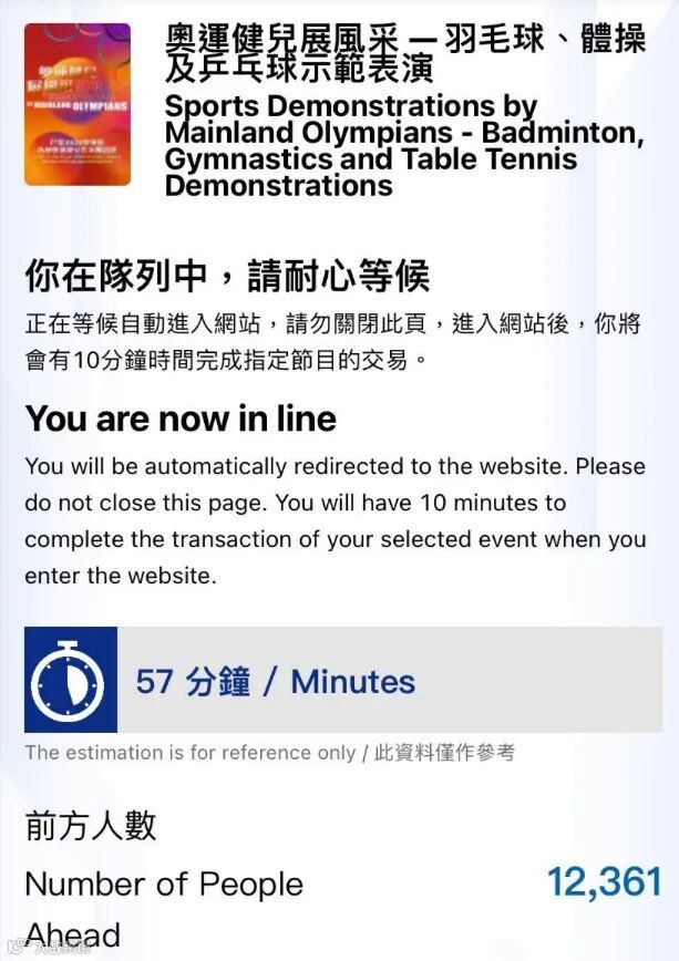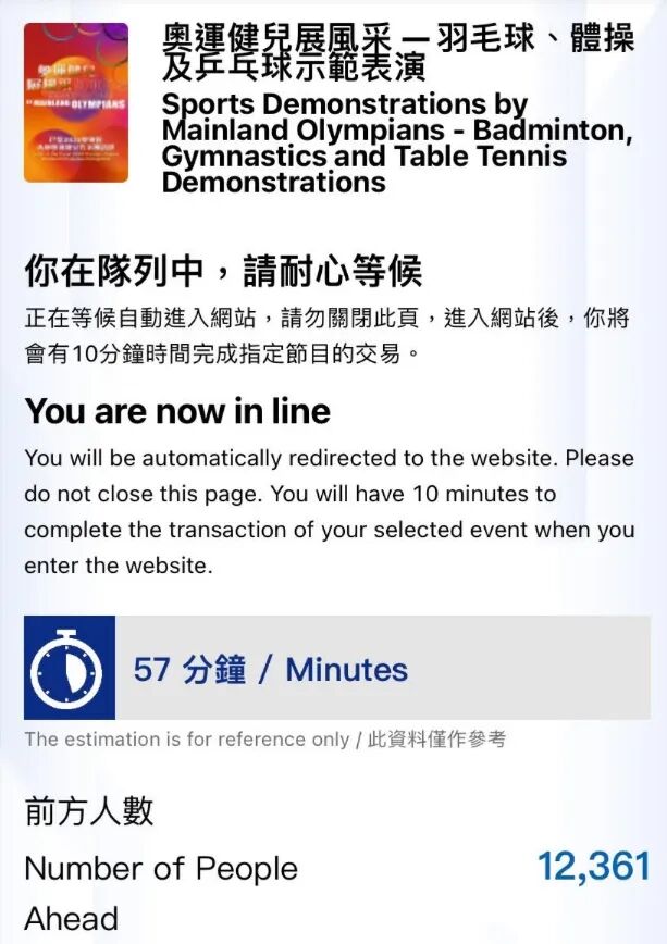 In the first 10 minutes of ticket sales, the online system showed that nearly 50,000 people were trying to buy tickets for the badminton, gymnastics and table tennis demonstrations, more than 41,000 were waiting to buy tickets for diving and swimming demonstrations, and over 25,000 were hoping to get tickets for the gala show.