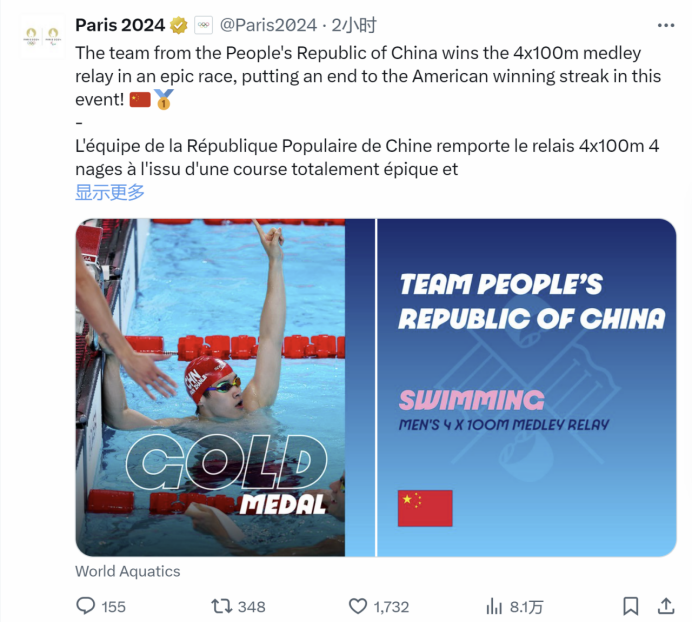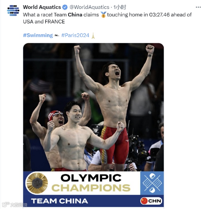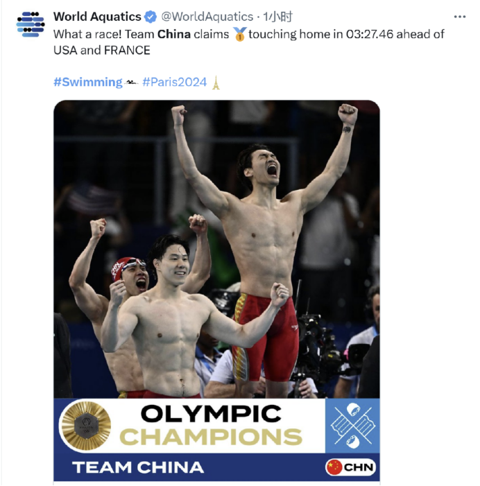 巴黎奥组委在社交媒体上用英语和法语写道:中国队史诗般地赢得了男子4x100m混合游泳接力的冠军,终结了美国在此项目的连胜。