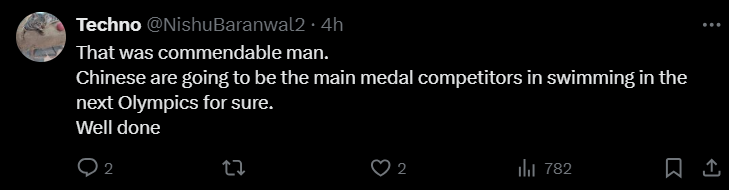 太赞了。我敢说中国将会是下一届奥运会游泳奖牌的实力竞争者。干得漂亮。